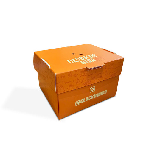 Custom printed chicken box personalised with your logo, branding or marketing material. Perfect for serving chicken wings and pieces. Our printed chicken boxes come flat pack ready for you to make up and are also great at saving space. Custom chicken boxes are made from sturdy 533mic (295gsm) Folding Box Board which is widely recycled. Easy to make up on the fly or in down time. Holds your chicken bits safely and securely for takeout or home delivery. Printed in 4 colour CMYK, delivered in only 2 - 3 weeks from artwork sign off on pallets.
