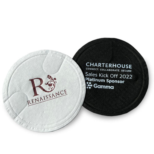 Printed Wax Back Coasters are a simple way to promote your brand. Our Round Wax Back Coasters can be printed in your choice of 1 colour or foil on white or black coaters to suit your branding. Available in round shape coasters with a wax base to stop drinks from slipping and capture light spillage. Low minimum orders gives you the opportunity to change designs frequently so you can regularly update promotions, offers and events. Elegant look and perfect promotional packaging for hotels, bars, pubs, gyms, businesses and much more. 100% Recyclable and biodegradable.