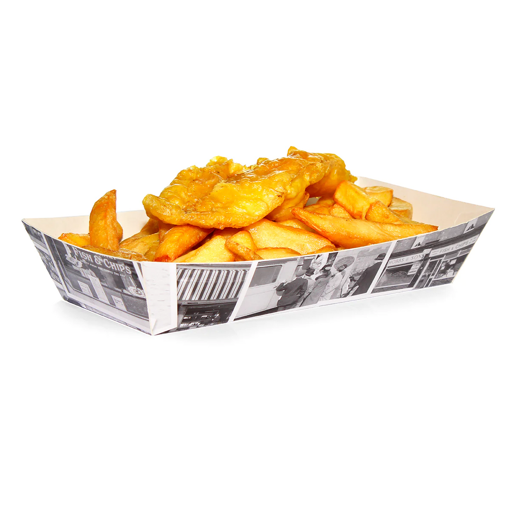 These trays are typically used for serving fish & chips, featuring a reminiscent & nostalgic, newsprint design. The thick board can accommodate a variety of both hot and cold foods, with plenty of sauce. The open top design allows for quick service, perfect for the busy caterer.