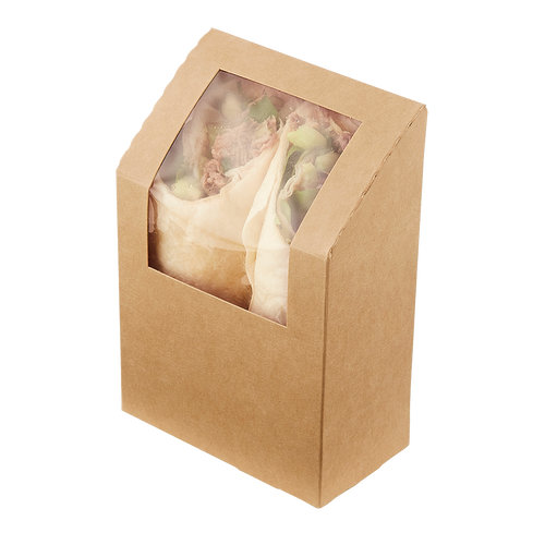 Our standard kraft wrap boxes are the perfect solution for serving cold food-to-go. Made from sustainable Kraft board with a film-front window, this product 100% recyclable. Ideal for serving two wrap halves side-by-side, it's an environmentally friendly and cost-effective choice.